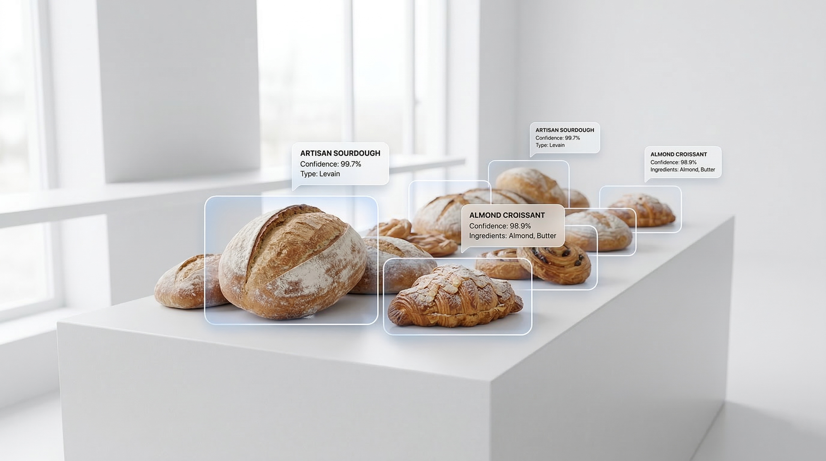 The images are instantly routed to our custom-trained Machine Learning vision model. Designed specifically for bakeries, it effortlessly recognizes overlapping artisan loaves, intricate pastries, and varying tray layouts.